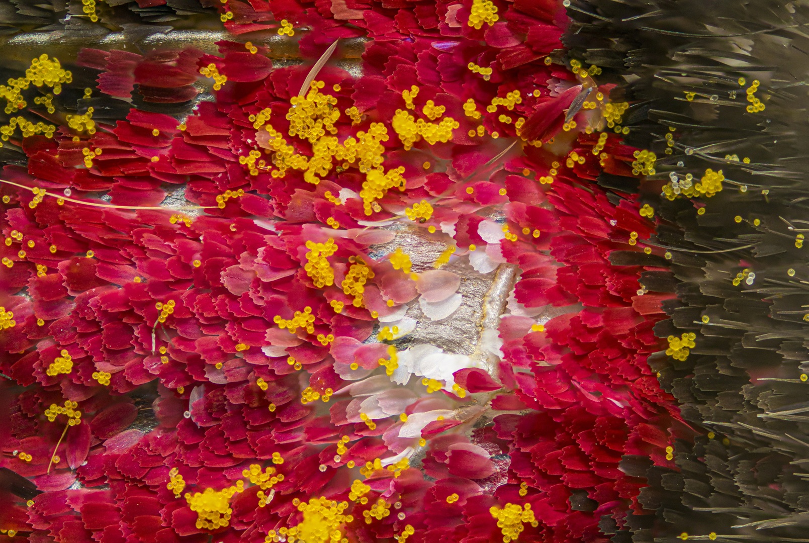Descripción de los autores: Las alas de una mariposa parecen simples superficies de color, pero bajo el aumento revelan un tapiz de diminutas escamas que reflejan la luz y atrapan el polen. En esta imagen, los granos amarillos destacan sobre el mosaico rojo de escamas, siendo testimonio de un encuentro entre dos mundos: el vegetal y el animal. Las mariposas, al igual que las abejas, son polinizadoras silenciosas que trasladan la fertilidad de una flor a otra mientras buscan alimento o descanso. Cada escama cumple una función aerodinámica y cromática, pero también se convierte en un vehículo involuntario de vida. Así, en lo más delicado del vuelo se esconde la fuerza que sostiene la diversidad de los ecosistemas terrestres.