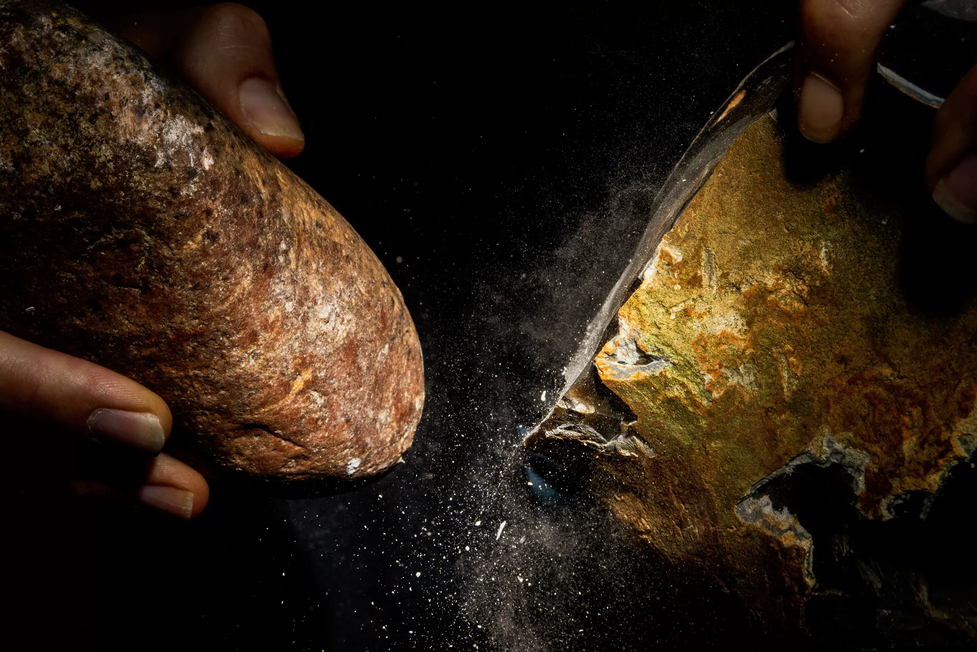 Descripción de la autora: Esta fotografía captura el momento exacto en el que un percutor de cuarcita impacta en un bloque de sílex. En este golpe no hay azar: hay intención, previsión y un propósito. La imagen representa la búsqueda y la decisión de transformar para resolver; el origen de la primera tecnología. Actualmente, la arqueología experimental recupera este proceso. Mediante la reproducción de la fabricación de herramientas líticas y las técnicas asociadas, la comunidad científica busca comprender cómo nuestros antepasados transformaron la piedra en herramientas y, con ello, el pensamiento en acción. El sílex fue, durante miles de años, un aliado fiel. Dominar su talla exigió planificación y transmisión de conocimientos. Fue, en definitiva, la génesis de la cultura material: el primer paso hacia la innovación que nos define como especie y nos hace humanos.