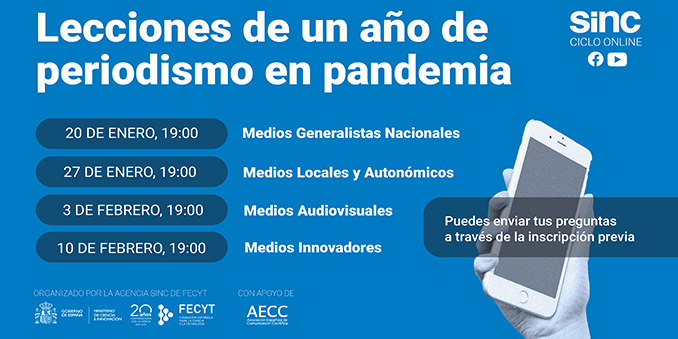 La agencia de noticias científicas SINC de la Fundación Española para la Ciencia y la Tecnología (FECYT), con el apoyo de la Asociación Española de Comunicación Científica (AECC), ha organizado el ciclo de debates online ‘Lecciones de un año de periodismo en pandemia’, donde periodistas y responsables de comunicación reflexionarán sobre las dificultades y el aprendizaje adquirido en estos meses de cobertura informativa sobre la COVID-19.