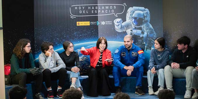 La sede de Alcobendas del MUNCYT ha acogido hoy un encuentro con la ministra de Ciencia, Innovación y Universidades, Diana Morant y el astronauta de la Agencia Espacial Europea (ESA) Pablo Álvarez con estudiantes de 4º de la ESO del Instituto de Educación Secundaria de Aldebarán de Alcobendas.