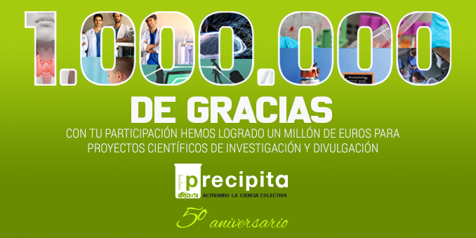 La plataforma de crowdfunding de donación Precipita acaba de alcanzar el millón de euros de recaudación coincidiendo con su quinto aniversario. FECYT impulsó esta plataforma en octubre de 2014 con el objetivo de potenciar la divulgación del conocimiento científico, acercar los centros de investigación a la sociedad y ofrecer una nueva herramienta de financiación y participación ciudadana.