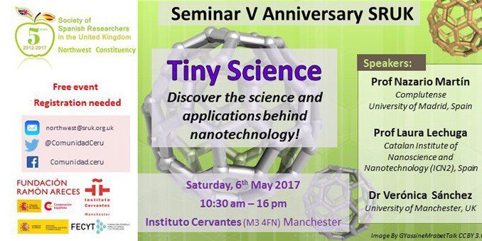 El pasado 6 de mayo de 2017 la Sociedad de Científicos Españoles en el Reino Unido (SRUK/CERU) celebró en el Instituto Cervantes de Mánchester la jornada "Tiny Science. The Science applications behind nanotechnology", ante 50 asistentes.