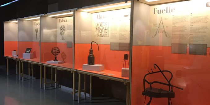 En veinte paneles expositivos se exhiben piezas de la colección del MUNCYT como anteojos, microscopio, globo terráqueo, ludión, fuelle de fragua, brújulas, entre otras, y algunas cedidas por el Museo Nacional de Ciencias Naturales de Madrid como por ejemplo una Caja conlepidópteros o un Pez piedra.