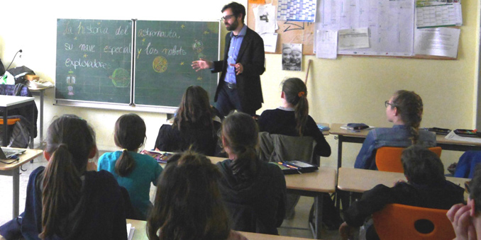 For one hour, boys and girls from the "Spanish Language and Culture Classroom Program" (ALCE), aged between 10 and 15, listened to the science stories of the FECYT scientific coordinator at the Embassy in Berlin, Dr. Guillermo Orts-Gil, about the astronaut Pedro Duque, the particle accelerator Alba in Spain and the robots developed by Dr Jose de Gea in Bremen.
